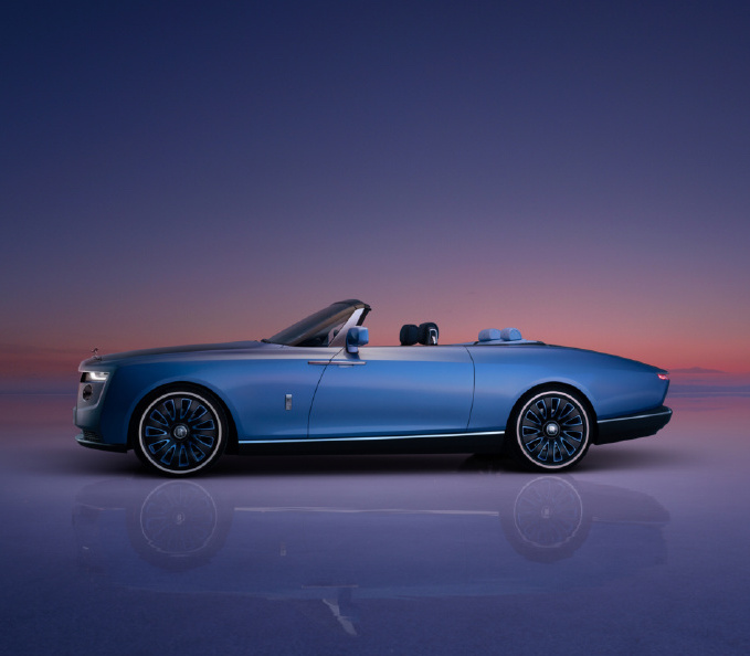 鬼面罩依然採用勞斯萊斯經典的「帕特農神廟」設計,但頭燈更加扁平和細長的尾燈相互輝映。車尾展示了最好的手工設計和尖端的工程技術。因為在傳統後備廂的位置,勞斯萊斯為其定制了類似於遊艇甲板般的待客區。「甲板」由灰黑色開孔Caleidolengo飾板製成,中間還設計了一把可折疊的專屬太陽傘,甚至在「甲板」下層還準備了兩張由勞斯萊斯設計、意大利傢具品牌Promemoria精心打造的雞尾酒凳。在內部,則是為用打造的一整套戶外用餐的餐具,以及可以在6攝氏度下快速冷藏的香檳冰箱。